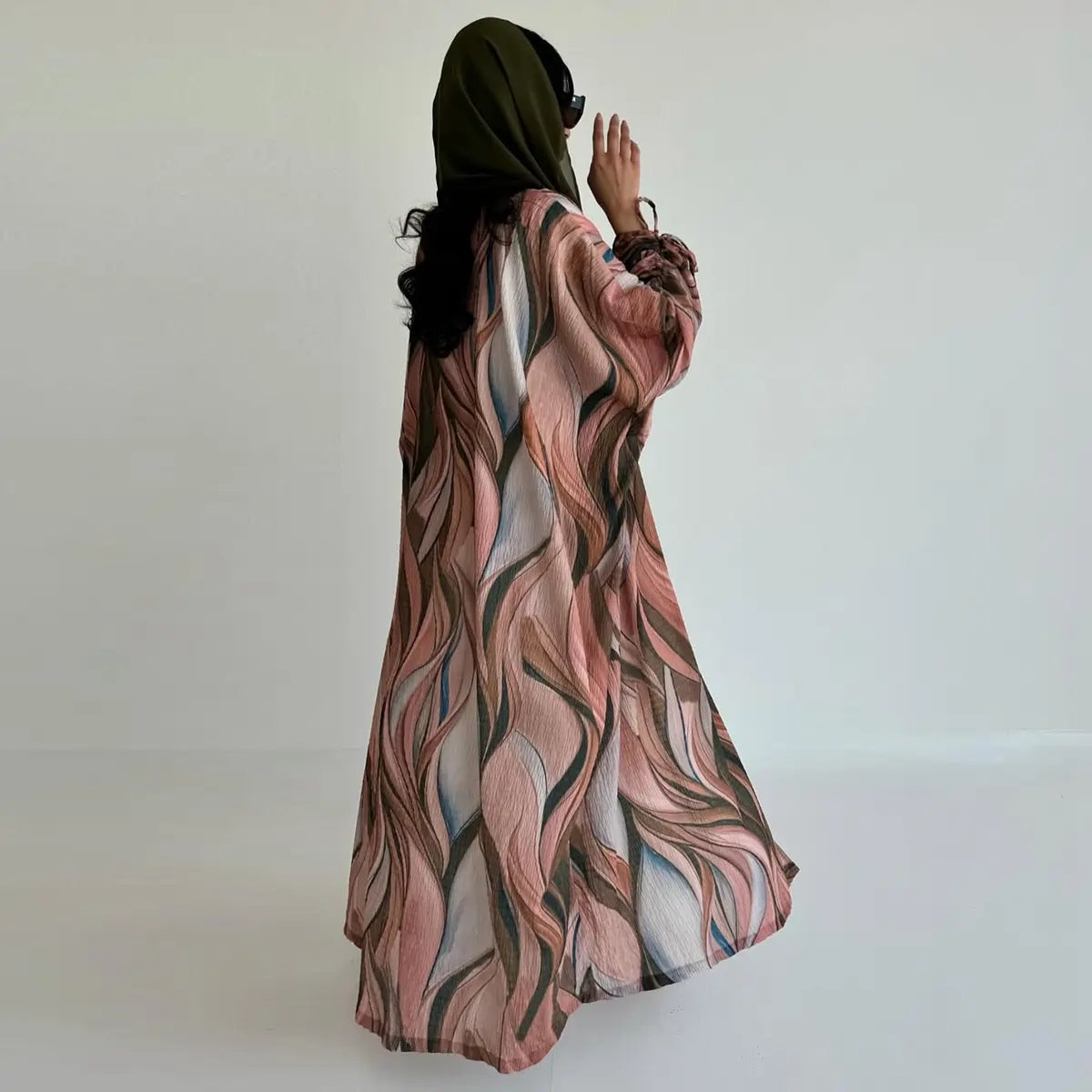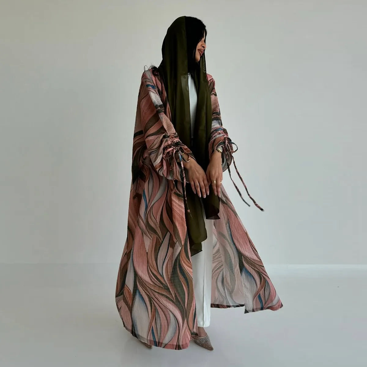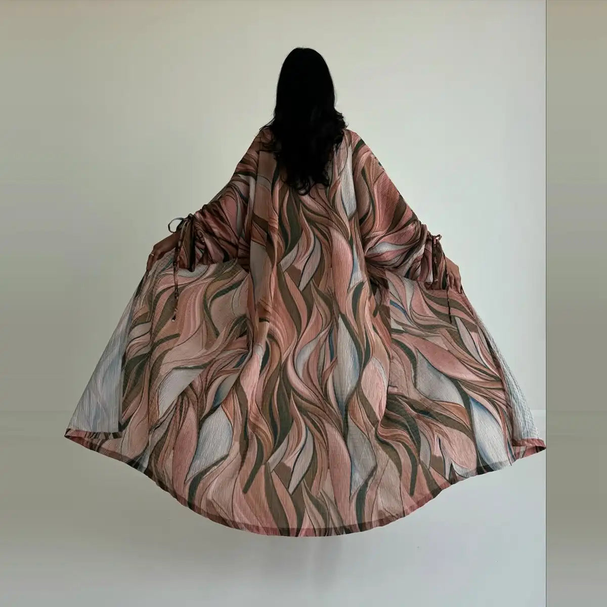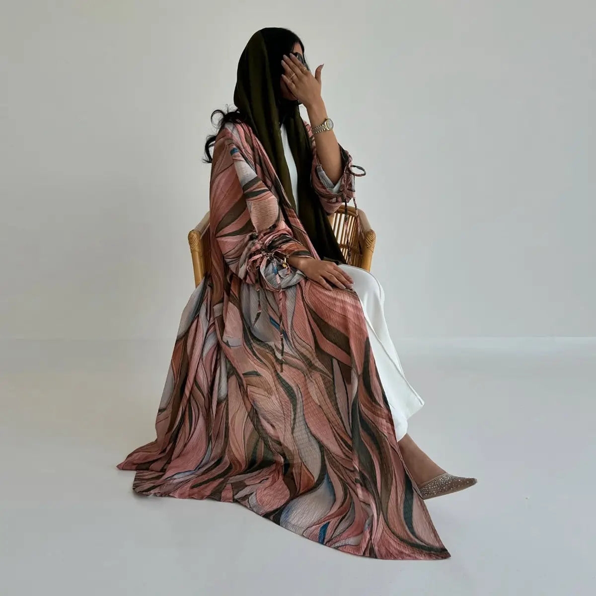 Drawstring Cuff Wrinkle Cardigan Open Abaya Dress #25207